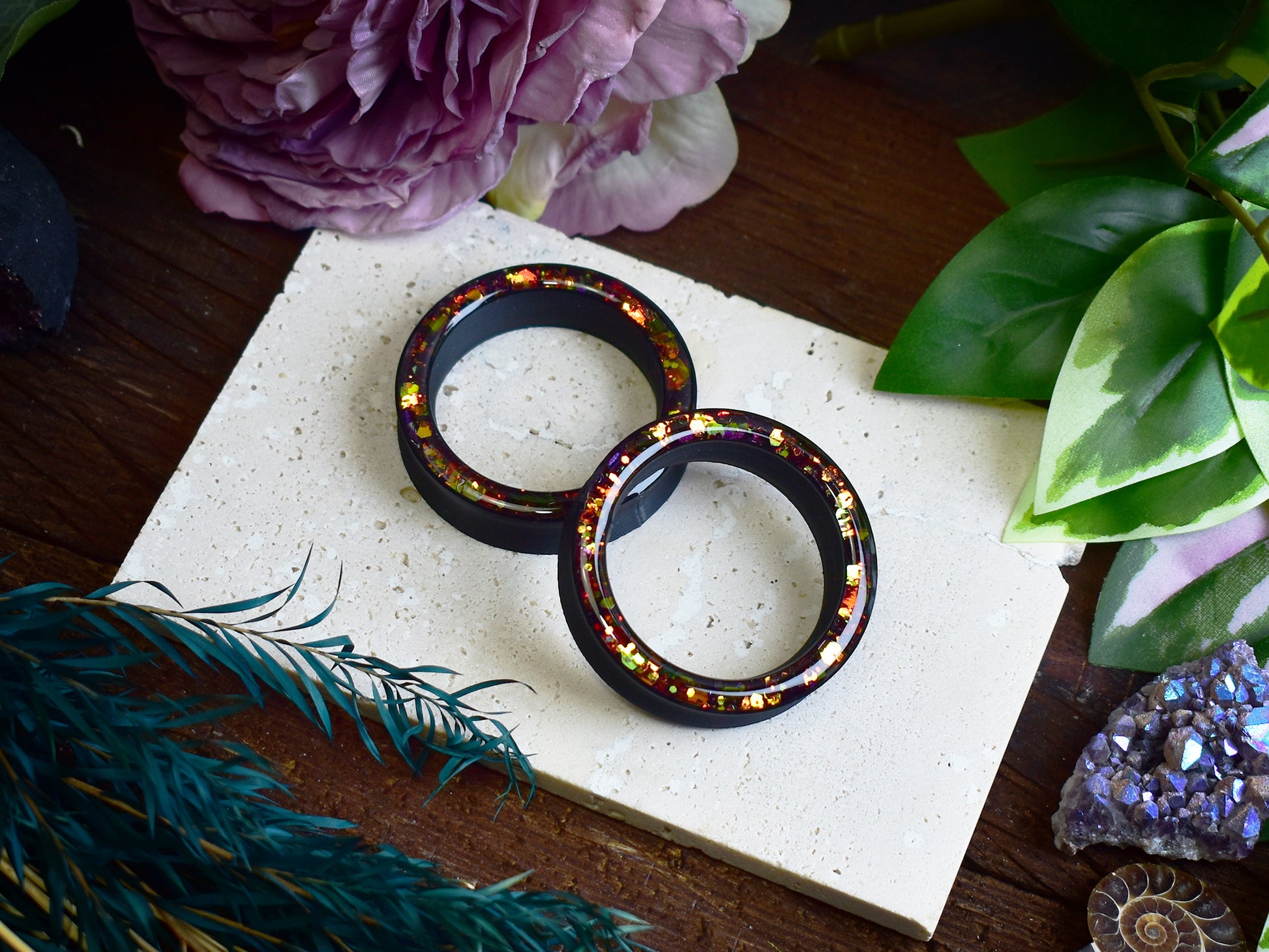 Túneles fabricados completamente con tecnología de impresión 3D de resina biocompatible. La parte trasera es cóncava, el frente está relleno de purpurina holográfica y cubierto con resina, lo que los hace ligeros. El grosor de la pared se mantiene constante en todos los tamaños - en tamaños más pequeños, la apertura es proporcionalmente menor, mientras que en tamaños más grandes es mayor.